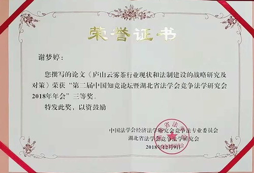 此次大会共有理论界和实务界的权威学者、法官律师、企业代表及媒体人士等200多人参加,围绕“互联网竞争及其法律规制”、“3D打印的知识产权与制造业市场竞争”、“反垄断法的修订与完善”、“知识产权资产证券化与资本市场竞争”四个知识产权法与竞争法相关领域的前沿和热点议题问题进行了深入的探讨。在8日晚的“知竞青年论坛”中,刘闻博士分享了其在庐山云雾茶地理标志产品保护研究的体会。刘博士从庐山云雾茶市场混乱的现状出发,分析了关于我国地理标志产品保护的困境及其解决路径,并与来自武汉大学、四川大学、华中农业大学、华东交通大学、武汉理工大学等高校的青年学者对相关问题进行了多方面、多角度的探讨,取得了良好的学术成效。此外,由刘闻和谢梦婷同学合作撰写的论文《庐山云雾茶行业现状和法制建设的战略研究及对策》获得了年会优秀论文三等奖。