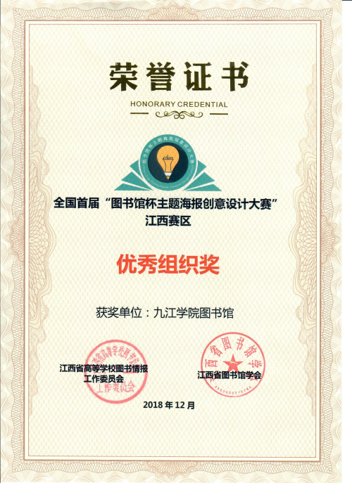 2018年,中国图书馆学会阅读推广委员会主办了主题为“新时代、新阅读、新未来”的全国首届“图书馆杯主题海报创意设计大赛”, 我馆认真组织读者围绕主题开展创意海报设计,在江西赛区中表现突出,荣获优秀组织奖。