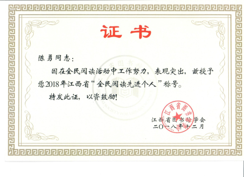 2018年,我省各级图书馆积极开展全民阅读活动,群众参与广泛,在社会营造了浓厚的阅读氛围。为鼓励先进,同时进一步调动各单位的积极性,此次大会上表彰了一批 2018年全民阅读先进单位和个人。我馆陈勇老师荣获“2018年全民阅读先进个人”荣誉称号。