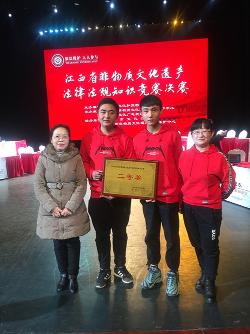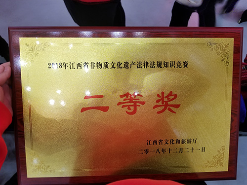 自2018年8月起,艺术学院杨堉淇同学先后参加了市级非遗法律法规知识竞赛初、决赛。经过层层选拔,最终进入九江市代表队,于12月21日随九江代表队参加由江西省文化和旅游厅主办的江西省非物质文化遗产法律法规知识竞赛决赛并最终获得二等奖。