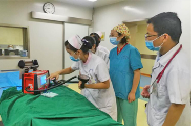 高危胸痛包括急性冠脉综合征ACS(急性ST段抬高型心肌梗死、急性非ST段抬高型心肌梗死和不稳定心绞痛)、急性肺梗塞、主动脉夹层、气胸、心包填塞等疾病,是近年来导致患者突发性死亡的主要原因。在演练过程中,多数科室医护人员对于急性胸痛患者的首次医疗接触敏感性较高,反应快速。对发生胸痛的患者,立即给予常规处置,吸氧、建立静脉通路、检测生命体征,迅速完成首份心电图,并初步判断心电图,传输至心电图室或胸痛微信群。心电图室出具报告后,医师立即拨打胸痛中心一键式启动电话,在心内科二线的指导下,给予相应的急救处理,并安全快速的转运至导管室行介入手术。在演练的最后阶段,模拟患者突发室颤,现场考核发病科室医护人员的除颤术技能操作。导管室殷璐护士长,为参与演练的医护人员详细讲解了除颤术的知识要点和步骤。每次演练结束后,督导专家会在心内科会议室对演练的环节和过程进行现场反馈。