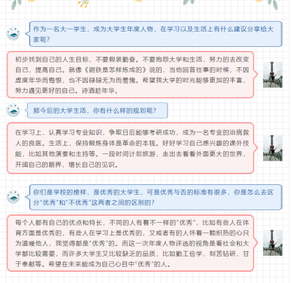 郭谢欣鹏:每个人都有自己的优点和特长,不同的人有着不一样的“优秀”,比如有些人在体育方面是优秀的,有些人在学习上是优秀的,又或者有的人怀着一颗炽热的心只为温暖他人,我觉得都是“优秀”的。而这一次年度人物评选的视角是看社会和大学都比较需要,而许多大学生又比较缺乏的品质,比如勤工俭学,刻苦钻研,甘于奉献等。希望在未来能成为自己心目中“优秀”的人