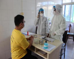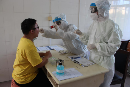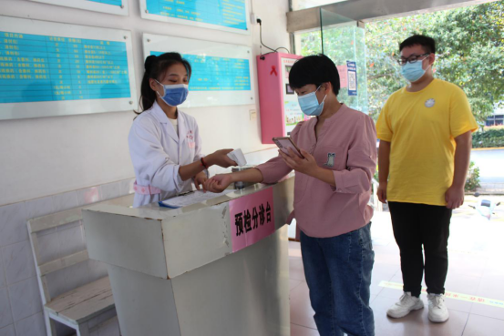 ↑学生进行手消后就坐,护士为其复测体温,医生用听诊器进行诊断与询问学生旅居史等基本情况并做好记录。