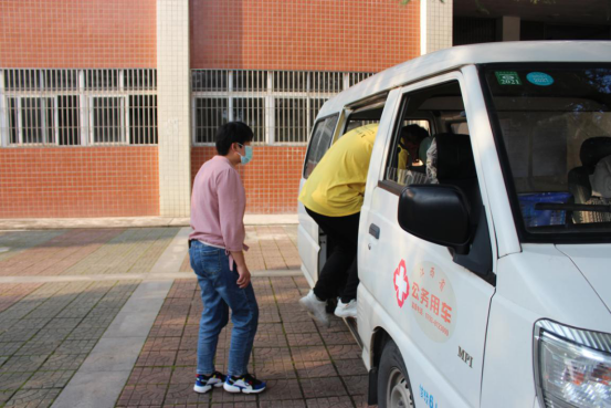 ↑班主任陪同该生乘坐校园转运车前往校医院