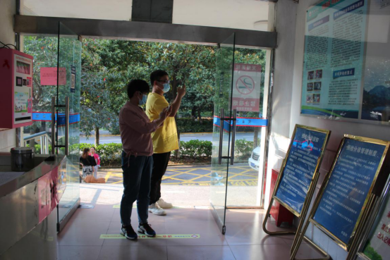 ↑到达校医院预检分诊处,配合扫码、测温、登记,测温显示异常,护士为其更换一次性医用外科口罩
