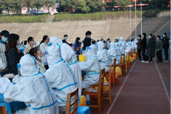 为全力以赴做好学校师生全员核酸检测工作,确保保质保量完成任务,附属医院领导高度重视,要求相关科室及时制订核酸采集工作方案,并组织好核酸采样、检测、保障等人员队伍,60名医护中大多数为去年驰援武汉医疗队的队员。检测现场,参检师生带好口罩,按照预先安排顺序,错峰进入运动场,每10人一组,扫码登记,在30个采集点检测采样,然后快速撤离采样区,整个过程井然有序。附属医院医护人员全副武装、各司其职,一边引导,一边迅速地完成咽拭子采集,工作高效运转。