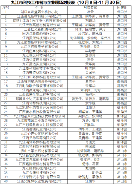 据介绍,本次市“双百行动”对接范围较广,主要聚焦庐山市、彭泽县、湖口县和都昌县四县市,时间从10月9日-11月30日,44位博士和专家深入了四县区40家企业进行了对接合作和技术服务。“
