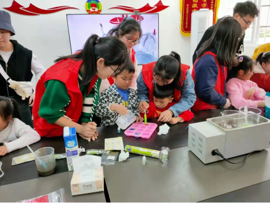 开班当天,在社区二楼活动室里,开始了“双减”社区周末班的第一课——制作手工皂。药生学院团委生物协会会长熊佳妮同学向参加活动的儿童介绍了“什么是皂基”,“如何用它制作手工皂”等。在讲解完手工皂的基本操作和注意事项以后,在场人员带领着儿童制作手工皂,用恒温水浴锅加热融化皂基,根据儿童喜欢的颜色将对应的可食用色素倒入原本是透明色和乳白色的皂基中,使其上色,再依次加入植物精油、花瓣、起泡剂等,再倒入模具中等待成型。手工皂成型后,社区儿童十分兴奋,纷纷向大学生哥哥姐姐们展示自己的作品,并最终带着自己做的手工皂在家长的带领下回家。团委青年们也在儿童离场后立即清理现场,确保不会给社区人员带来清理压力。