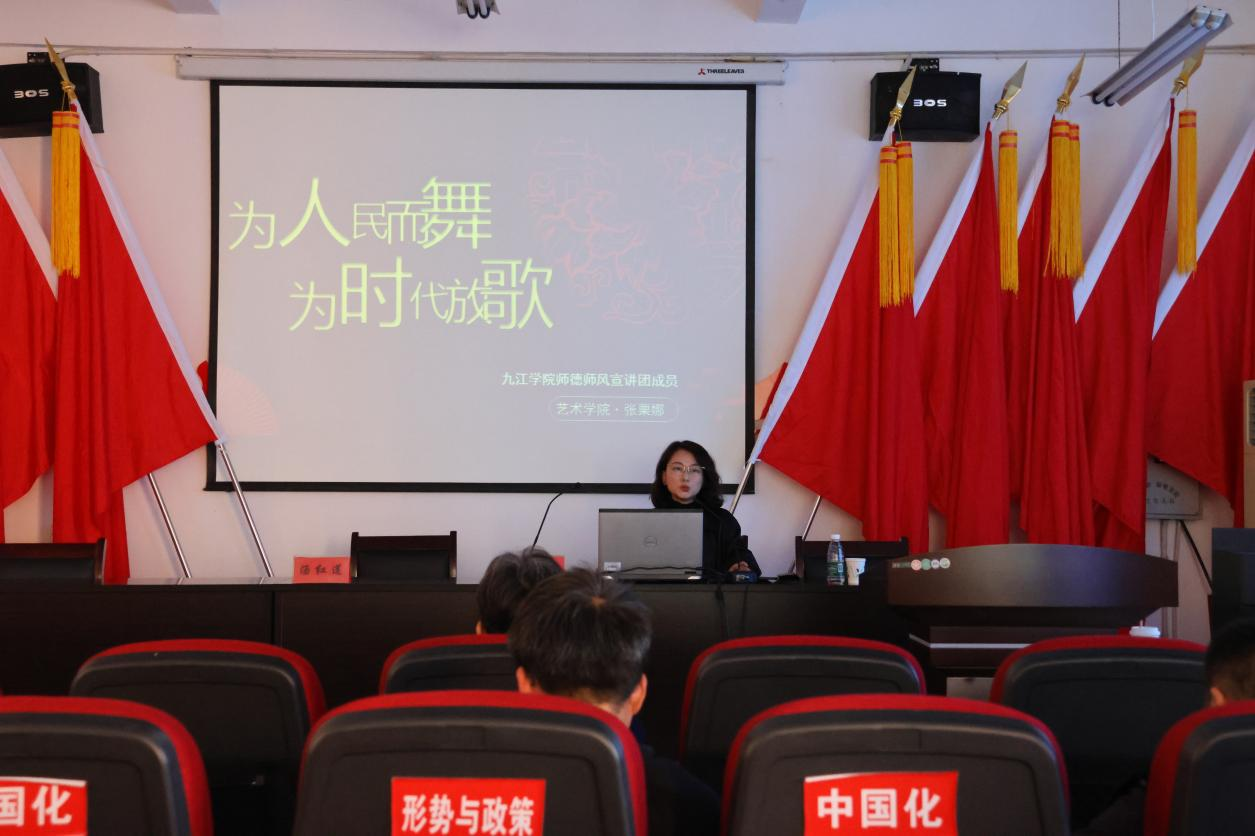 教书育人楷模、师德师风宣讲团成员张栗娜以《为人民而舞、为时代放歌》为题向马克思主义学院全体教师作了师德师风宣讲。从教十八年来,张栗娜始终坚守在教学一线,对教育事业有着执着的追求和强烈的使命感,乐当学生的“引路人”;在专业创作上精益求精,勇攀高峰,为大力传播江西地域文化起到了积极作用。