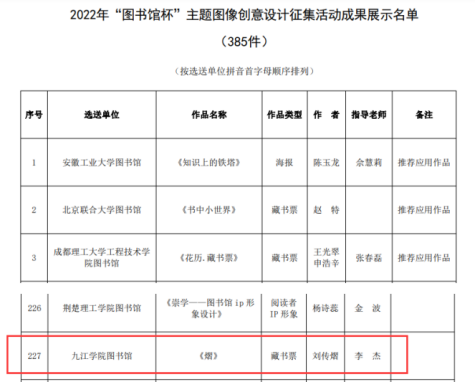 2022年“图书馆杯” 主题图像创意设计征集活动 作为两年一届的艺术设计与阅读推广盛事,2022年“图书馆杯”以“阅见美好,悦在图书馆”为主题,面向全国共征集图像作品15331件。经组织单位推荐、网络研议和现场研议三个环节,产生“成果展示名单”作品385件。我校外国语学院刘传熠同学的藏书票作品《熠》成功入选。