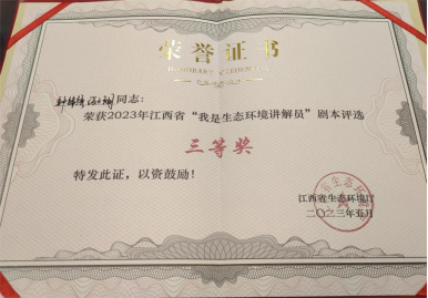 5月19日,由江西省生态环境厅主办的江西省2023年“我是生态环境讲解员”选拔赛决赛在省生态环境厅成功举行。我校资源环境学院的程曦同学从预选、初赛中脱颖而出,并在决赛中发挥出色,荣获2023年江西省“我是生态环境讲解员”选拔赛二等奖,并将作为参加生态环境部比赛的候补人选参加后期培训;同时,资源环境学院的钟锦绣、张天翔、朱益锋同学还荣获优秀剧本三等奖2项。