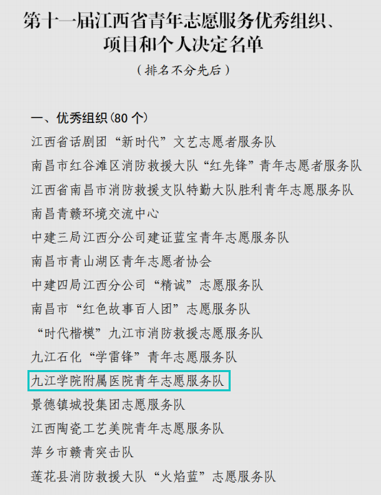 附属医院青年志愿服务队因工作扎实、成绩突出、群众认可、示范引领作用强,荣获“江西省青年志愿服务优秀组织”称号。