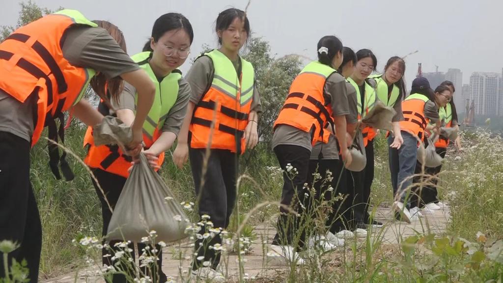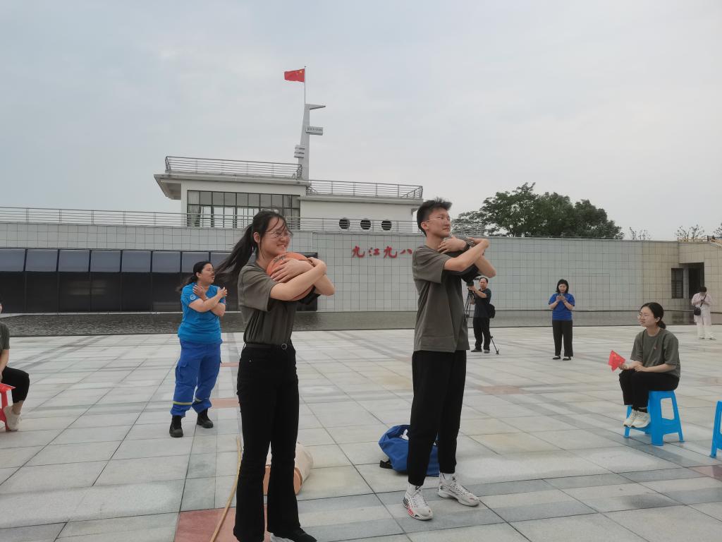 “红细胞”行走课堂新推出的实景思政课《大江安澜》中,外国语学院青年学生进行抗洪抢险演练的情景。这次实景思政课依托九江九八抗洪旧址,实景再现1998年长江流域波澜壮阔的抗洪斗争史,让青年学子从伟大抗洪精神中凝聚奋进力量。