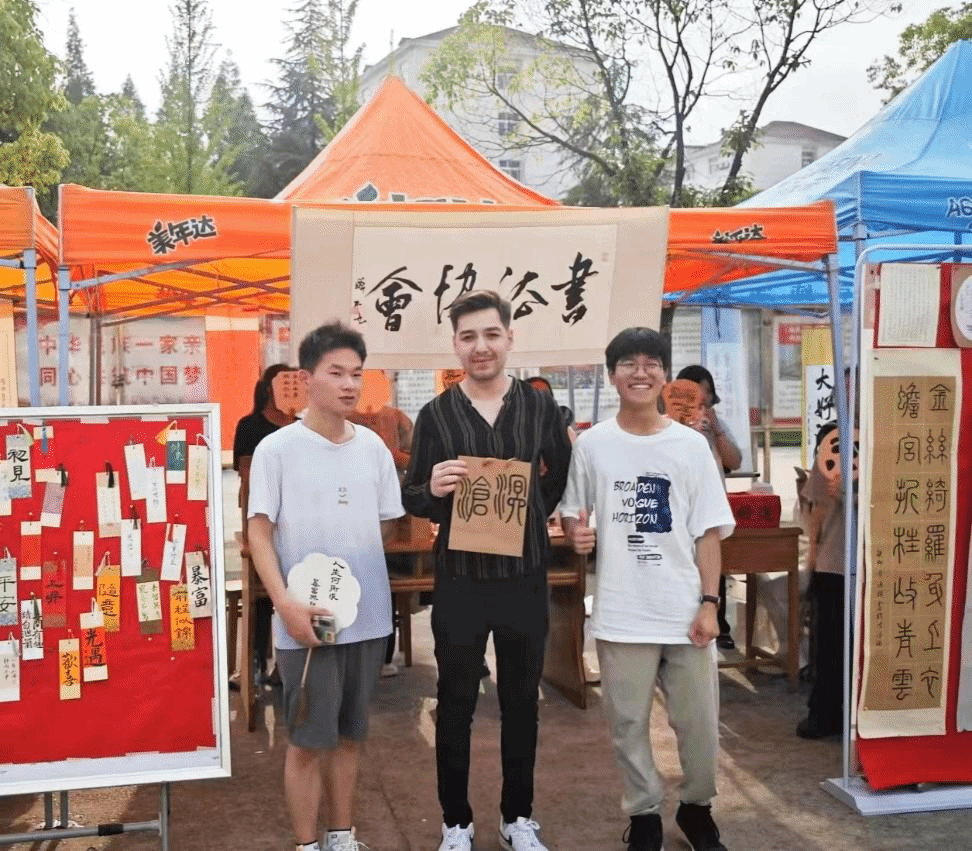 学习,让我认识了一个神奇、伟大、文明、开放、包容的中国。我特别喜欢中国的毛笔字,看上去像一幅画其实又是一幅字,好看又有意义。”来自乌兹别克斯坦的留学生JAKHONGIR说道。“书法是中国的国粹,我从小练习书法,今年已经有12年了,每个传统节日,我都会积极参加社团组织的各种书法活动,用我的力量弘扬中华传统文化、传播中国声音、讲述中国故事。”书法协会池芳明同学说。