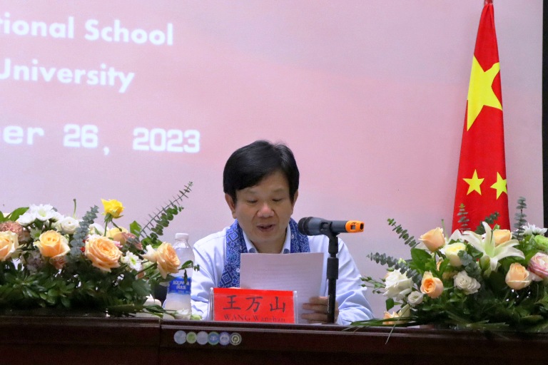 在致辞中,王万山代表学校向2023年入校的留学生表示欢迎,并希望留学生们尽快适应在