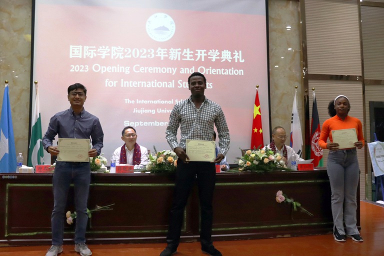 与会领导为留学生们颁发了江西省人民政府奖学金、汉语学习优秀奖学金,并在典礼纪念册签名留念。