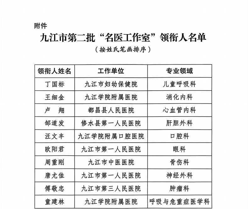 为扎实推进卫生计生系统人才队伍建设,加大高层次医学人才培养力度。近日,中共九江市委人才工作领导小组办公室、九江市卫生健康委员会印发了《关于确定九江市第二批名医工作室领衔人人选的通知》, 附属口腔医院院长汪文丰, 附属医院消化内一科主任王细金、呼吸与危重症医学科主任童建林荣登九江市第二批名医工作室领衔人榜单。