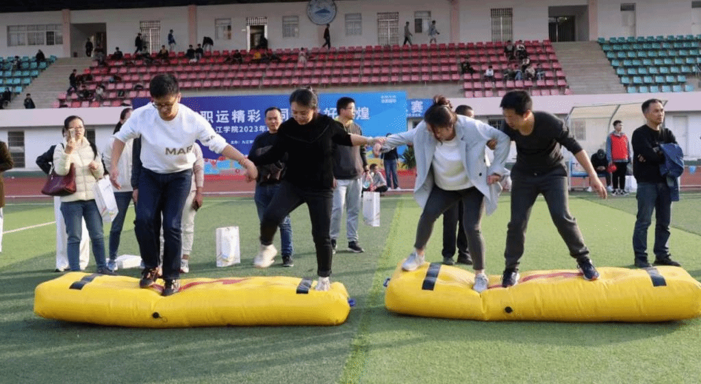 本届教职工趣味运动会比赛共有“有的放矢”“融圈入城”“稳中求进”“足下功夫”和“同舟共济”5个项目。比赛项目场场精彩,趣味横生,赛场加油声、呐喊声、欢笑声接连不断,充分体现了此次趣味运动会“共享职运精彩、同创美好辉煌”的主题。