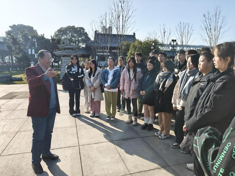 在这堂主题思政教育课中,师生们来到九江长江国家文化公园的琵琶亭前。“身后的琵琶亭,伫立在浔阳江头,目睹着一江清水潺潺东流,见证着九江这片热土的建设和发展,迎来送往一批批慕名前来参观的游客。”作为主讲,学院党委副书记沈杨向同学们介绍了身后的琵琶亭及其历史典故。同学们了解到——这就是九江人民为了纪念当年白居易谪任江州司马时写下著名诗篇《琵琶行》的地方,并纷纷诵读“浔阳江头夜送客,枫叶荻花秋瑟瑟……”等千古名句。