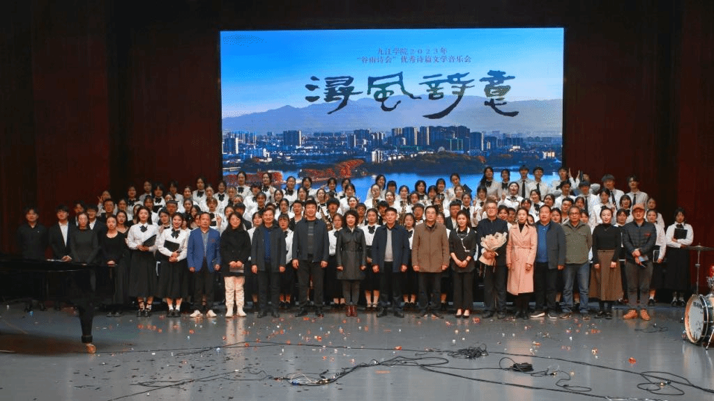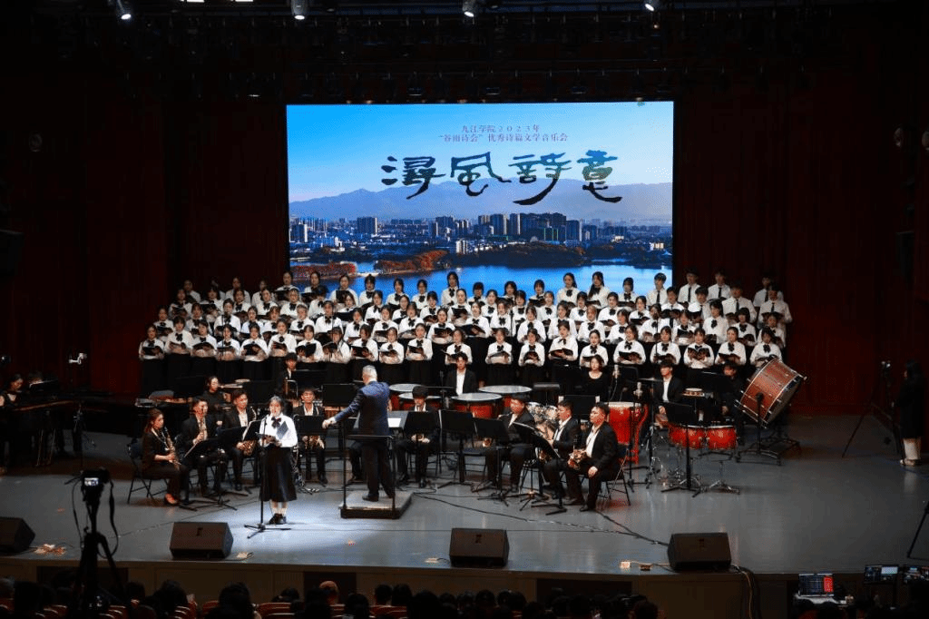 九天风露下银汉,万里江山入画图;谁道浔阳音乐好,只缘人世有欢娱。12月14日晚, 2023年“谷雨诗会”优秀诗篇文学音乐会在艺术学院音乐厅成功出演。该场诗歌音乐会由文学院、艺术学院联合主办,两个学院的四个艺术团队、百余名师生共同出品。校长陈小林、纪委书记李广欣到场观演。九江市委宣传部、九江市委台办、九江市文联、九江市作协、九江市电视总台、濂溪区对外合作交流中心(台办)等单位相关负责人, 教务处、学生处、国际合作交流处、团委、文学院和艺术学院等部门负责人以及师生代表出席观赏。