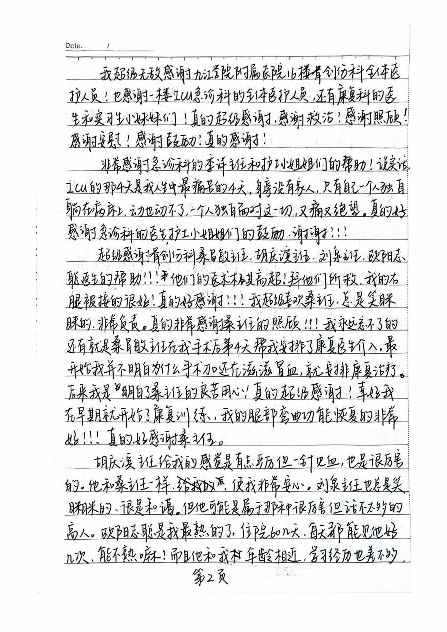 她在信里写道:“我超级无敌感谢 附属医院16楼骨创伤科全体医护人员!也感谢一楼ICU急诊科的全体医护人员,还有康复科的医生和实习生小妹妹们!真的超级感谢,感谢救助!感谢照顾!感谢鼓励!真的感谢!”随性俏皮的文风,却满是真情实感,也能看出,长时间的住院,她早已与医护处成朋友。