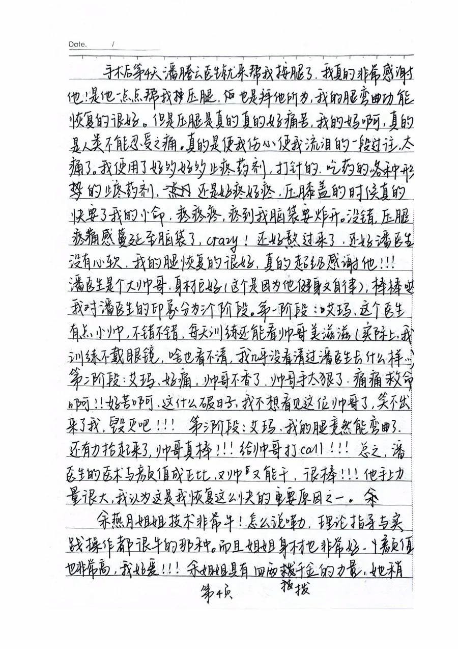 11月10日她转入了骨创伤科,经多方会诊后,进行了右股骨骨折切开复位钢板内固定术、同种异体骨植骨术、右胫骨骨折闭合复位髓内针内固定术等。邱子娴在信中写道:“我永远忘不了的就是,桑昌敏主任在我手术第四天帮我安排了康复医生介入,最开始我不理解为什么手术刀口还在嗞嗞冒血,就安排康复治疗。后来我明白了他的良苦用心,真的超级感谢。”