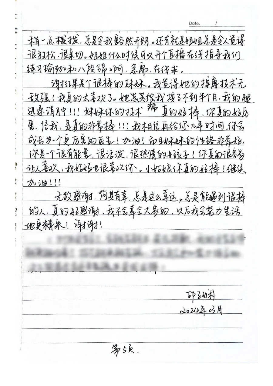 “我从来没有想过,患者能将我们每个医生的姓名、工作细节,包括每个科室的特点等许多细微的地方,都记得清清楚楚。2500字,5页纸,一笔一画的真情实感,感动了我们每一位医生!” 附属医院骨科副主任桑昌敏说:“其实作为医生,这些细节不过是工作必须和应该去做的。她一直称赞我们,事实上,作为一个患者,她给予我们的一点都不少,她的乐观善良,让我们充满力量。毕竟,在医者心中,双向奔赴的医患关系才是最好的!”