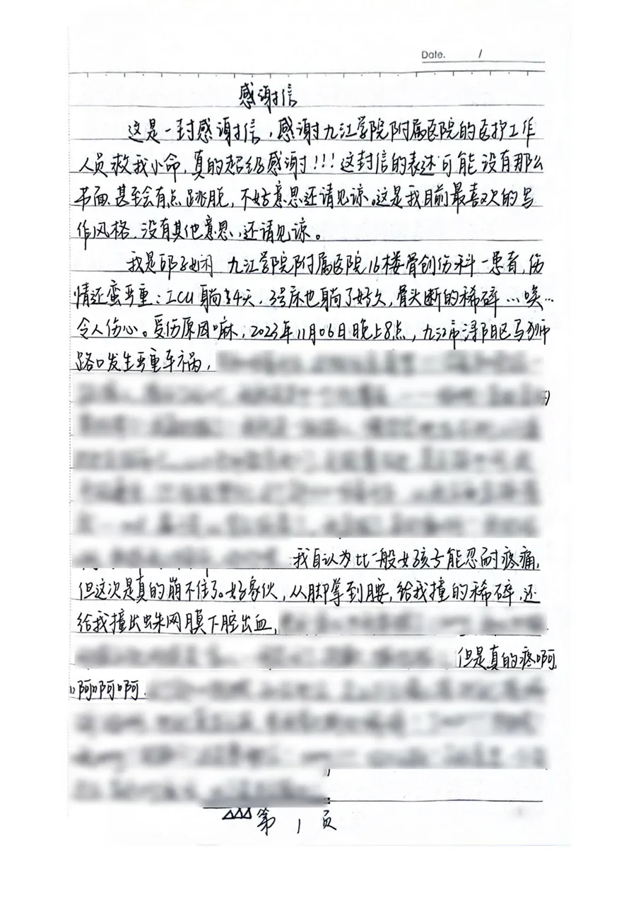 来信的人,是已从骨创伤科出院的26岁患者邱子娴。去年11月6日,她因一起严重交通事故导致全身多发性骨折,被送到了 附属医院,在经历了急诊ICU 4天,骨创伤科和康复科住院60余天后,顺利出院。