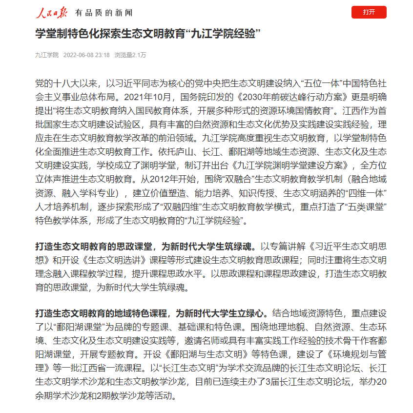 打造渊明学堂,探索特色思政教育。2022年,学院正式成立渊明学堂,坚持每年开办一期长江生态文明试验班,组建长江生态文明田野调查队,每月开展一期长江生态文明学术沙龙、生态文明教学沙龙活动,精心打造“鄱阳湖大课堂”高端特色开放课堂。先后邀请中国科学院江桂斌院士、江西省人民政府原副省长胡振鹏教授等多名业内知名专家围绕鄱阳湖流域地理地貌、自然资源、生态环境保护、生态文化及生态文明实践等开展专题教育。