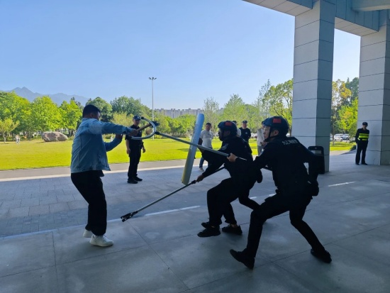 为进一步维护校园安全稳定和加强平安校园建设,增强全校师生反恐防暴意识和能力,提高安保人员反恐防暴应急处理能力,5月13日,我校保卫处联合濂溪区特巡警大队在厚德楼前开展反恐防暴应急处置实训演练。