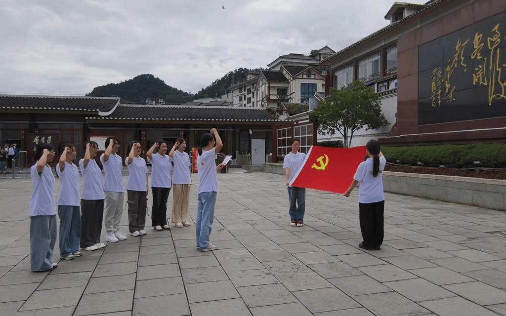 面向党旗,在党员教师陈筱云的带领下,全队重温入党誓词,铭记“坚定信念、坚持真理、独立自主、团结统一”的遵义会议精神。