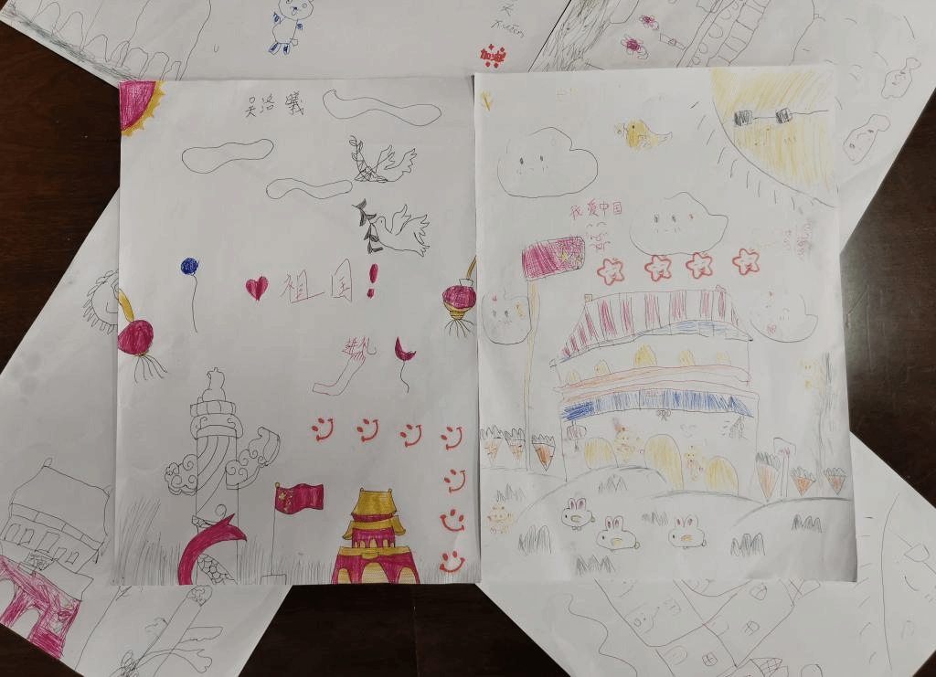 (孩子们创作的“我爱祖国”绘画作品)