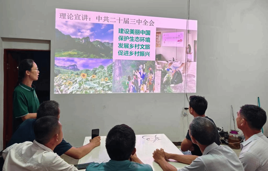 服务队师生重点介绍党的二十届三中全会中关于建设美丽中国、发展乡村文旅的内容。同时,展示了村里儿童的“环保课”以及共同捡拾垃圾的劳动成果,促进村民提升环保意识,共筑绿色振兴梦。