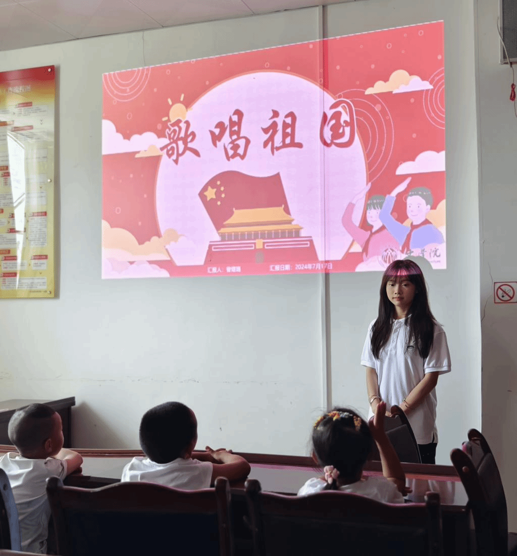 (队员曾煜璐教授孩子们演唱《歌唱祖国》)