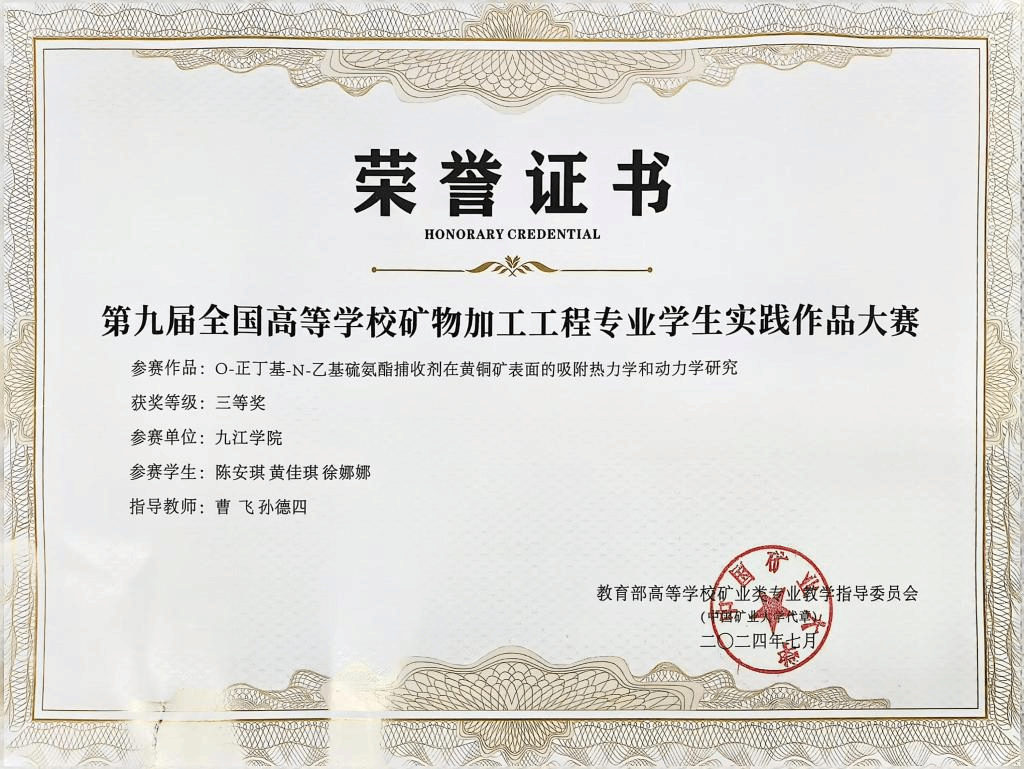 近日,第九届全国高等学校矿物加工工程专业学生实践作品大赛在福州市举行。由我校化学化工学院陈安琪、黄佳琪和徐娜娜等3位同学完成,曹飞、孙德四老师指导的参赛作品——“O-正丁基-N-乙基硫氨酯捕收剂在黄铜矿表面的吸附热力学和动力学研究”,在激烈的竞争中脱颖而出,荣获全国三等奖。