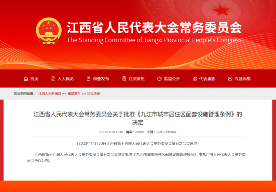 江西省人民代表大会常务委员会关于批准《九江市城市居住区配套设施管理条例》的决定
