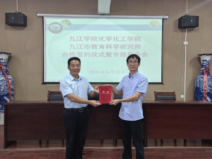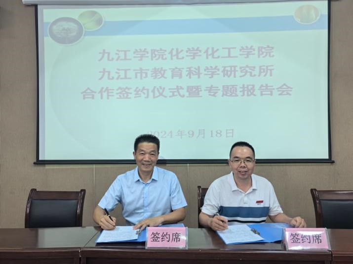 为贯彻落实习近平总书记在全国教育大会上的重要指示精神,实施教育家精神铸魂强师行动,全面推进基础教育协同提质行动,9月18日上午,化学化工学院与九江市教育科学研究所举行合作协议签约仪式暨专题报告会。副校长李松志,市教育科学研究所胥明辉书记/所长,我校教务处、化学化工学院负责人,部分教师代表,化学(师范)专业2022级和2023级全体学生,约120人参会。