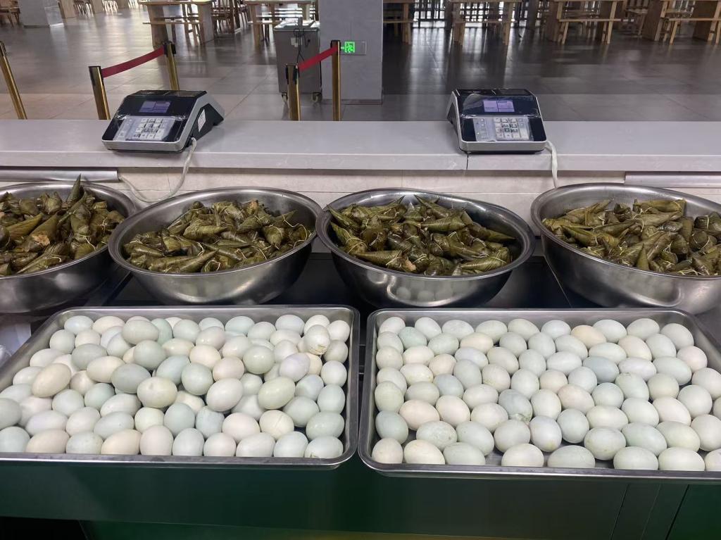 后勤管理处提前准备了千余份教职工伴手礼。每份礼盒内含手工粽子、鸭蛋与艾草香包,既传递“平安幸福” 的美好寓意,更以食材的温热触感让教职工在忙碌工作中感受家的温馨。而在学生学生专场,两万只粽子与一万枚鸭蛋也在各食堂被有序发放。“没想到在学校也能收到端午礼物!” 一位大一学生捧着粽子感慨,这份惊喜让远离家乡的学子深切体会到校园的温度。发放现场,后勤人员还同步讲解端午习俗,让传统节日文化在互动中自然传承。