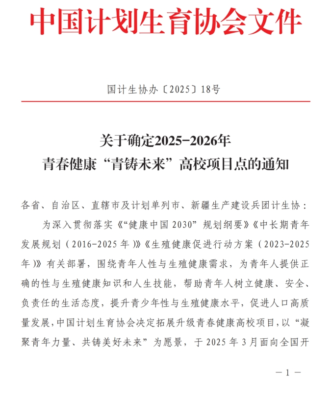 近日,中国计划生育协会正式公布了2025-2026年青春健康“青铸未来”高校项目点名单。我校校医院申报的“青春健康,铸享未来”项目从全国600余所高校中脱颖而出,成功入选。这是我校继2023年成功获批并顺利结项中国计生协高校项目后,再次获批项目点,标志着我校青春健康教育工作得到持续认可。