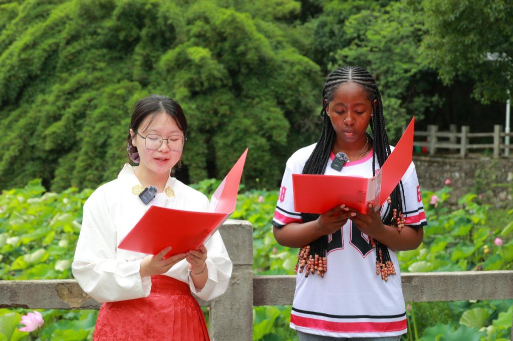师生与本地朗诵者身着传统服饰,以标准流畅的普通话演绎《归园田居》《饮酒》等陶渊明代表作。当加纳留学生Janice用清亮的嗓音诵出“少无适俗韵,性本爱丘山”时,现场响起热烈掌声。这位非洲姑娘字正腔圆的发音与真挚的情感表达,成为中华诗词跨越国界、联结人心的生动注脚。
