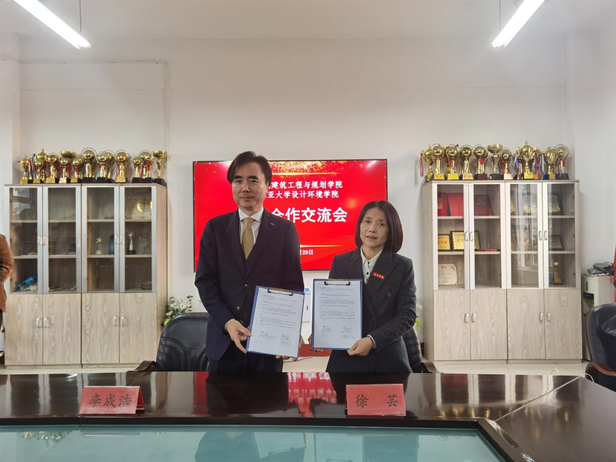 建筑工程与规划学院与韩国东亚大学设计环境学院合作交流会议在望庐楼举行。双方以“深化合作、互学互鉴、共育英才”为主题进行会谈,并签署了《合作协议书》,标志着两校学院层面在教育教学、学科建设、人才培养等领域的合作进入实质性推进阶段。
