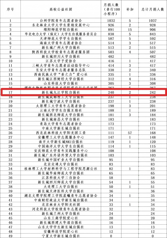 自强社凭借突出的组织动员能力与扎实的公益实践,在全国高校公益社团中荣获全国第17名的优异成绩,充分展现了