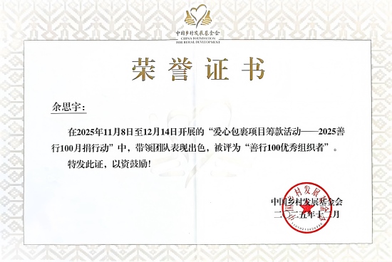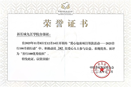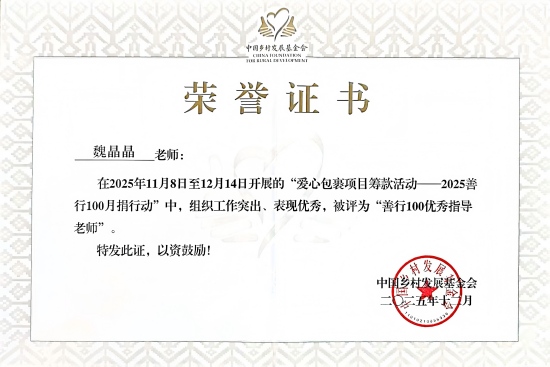 近日,2025年中国乡村发展基金会“善行100”月捐行动表彰大会圆满落幕。我校学生工作处(学生资助管理中心)指导的新长城