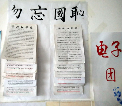 9月18日上午,在阵阵防空警报声中,学院将评选出的高质量的10件稿件在竞知楼9楼向全院学生进行展示,以此来进一步激发全院学生的爱国热情,教育学生牢记历史,勿忘国耻,珍爱和平,为实现伟大的“中国梦”发奋学习,为实现中华民族伟大复兴而奋斗。