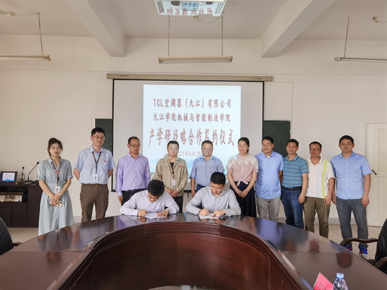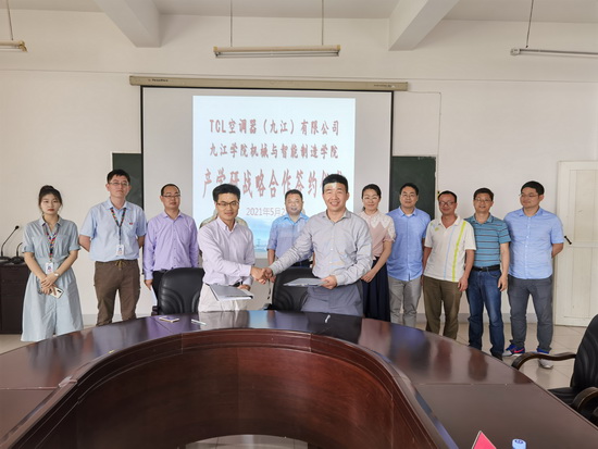 经过多次走访、调研和交流后,2021年5月28日上午,TCL空调器(九江)有限公司总经理李心安带领公司设备课长石召、人力资源与行政高级经理郭舜、招聘主管管超、高级薪酬福利专员陈兰等一行来到机械学院,共议产学研合作事宜,双方签订了产学研合作框架协议。机械学院院领导黄强、舒长兴、王英惠以及部分教师代表参加会议。