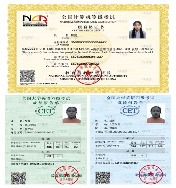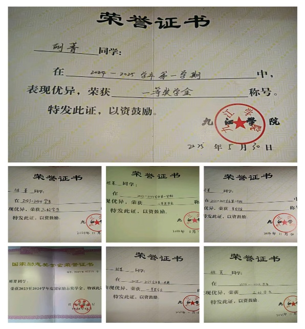 “立身以立学为先,立学以读书为本。”胡菁始终将专业学习放在首位,以踏实的态度和钻研的精神深耕数学领域。她不断优化学习方法,注重知识体系的构建与理解,学业成绩始终名列前茅。在夯实专业基础的同时,她积极拓展综合素质,相继通过大学英语四六级、普通话等级考试、全国计算机二级等能力认证。凭借持续优异的表现,她曾获国家励志奖学金一次、校级一等奖学金三次、二等奖学金一次,并两次获评“三好学生”称号。
