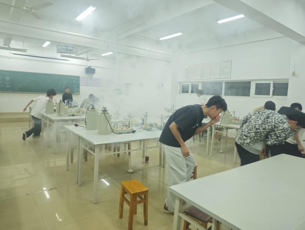 演练中,工作人员触发发烟罐后,浓烟迅速弥漫实验室。参与学生冷静应对,启动应急响应,用手捂口鼻、弯腰低姿,沿着预定路线快速撤离。全程行动有序、互帮互助,仅 3 分钟全员抵达安全集合点,展现良好应急素养。