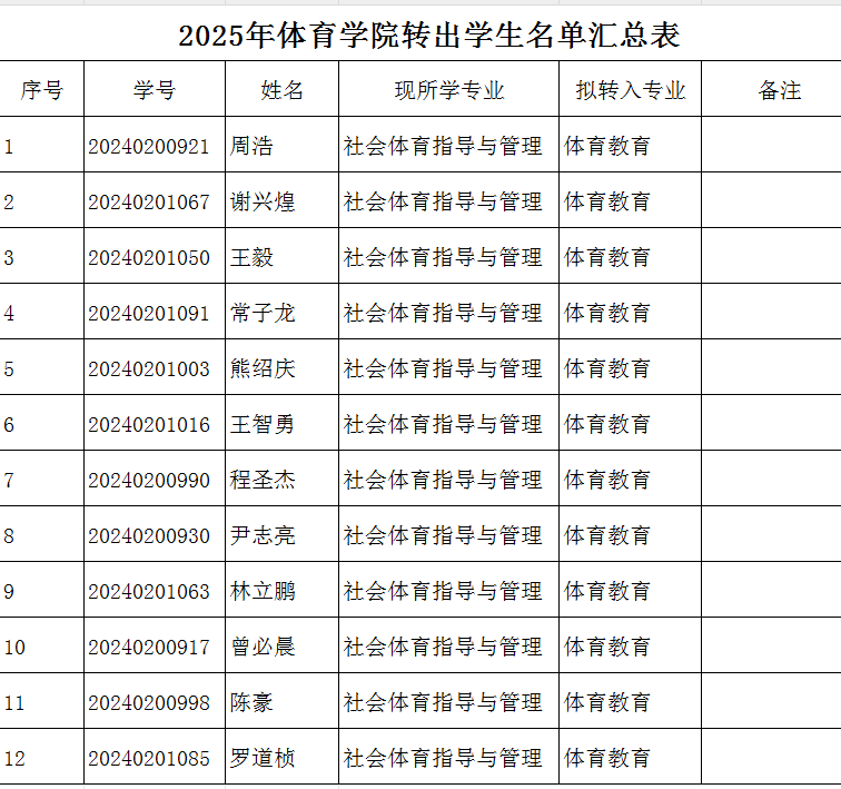 根据《 学生转专业管理办法(试行)》九院字【2024】111号文件的规定,经过学生本人申请,且申请转出人数符合学校的规定,批准2024级社会体育指导与管理专业的12名学生拟转出申请,公示名单如下: