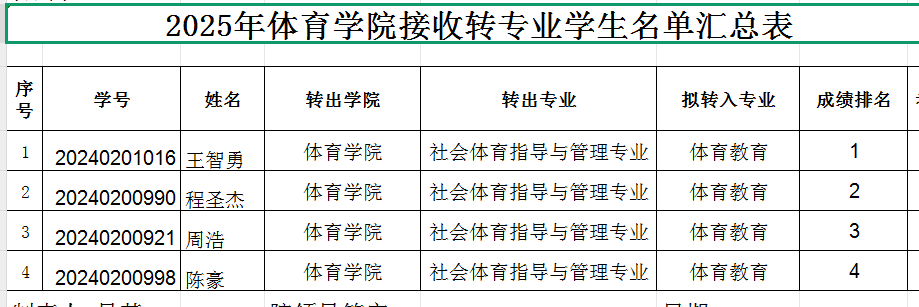 根据《 学生转专业管理办法(试行)》九院字【2024】1体育教育专业的转入计划从高分到低分确定转入名单,拟批准2024级社会体育指导与管理专业的4名学生拟转入体育教育专业,名单公示如下:
