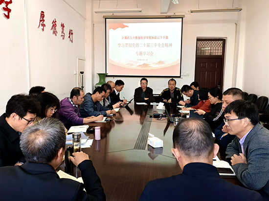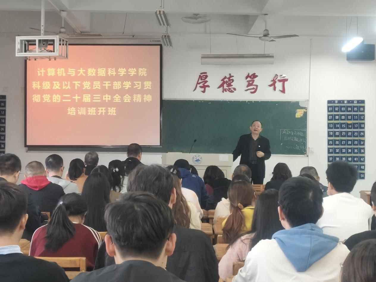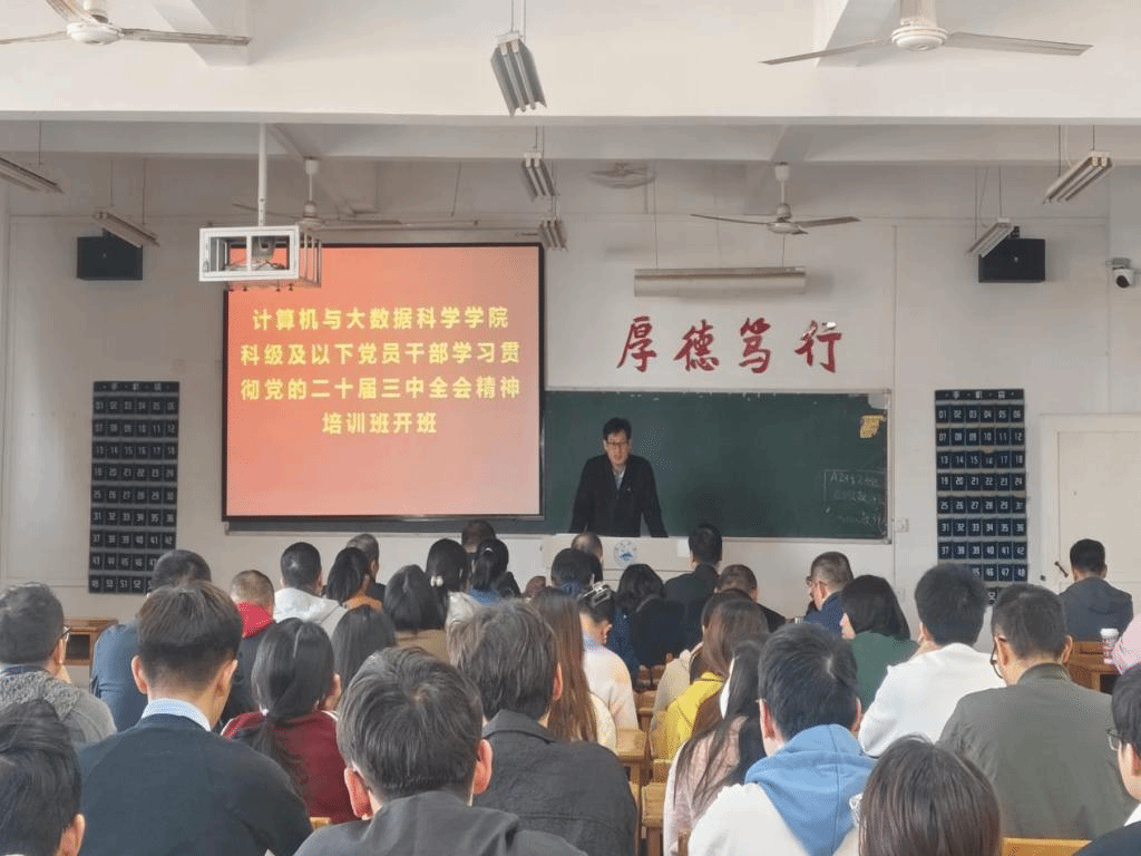 为深入学习贯彻党的二十届三中全会精神,深刻领会习近平总书记关于全面深化改革的一系列新思想、新观点、新论断,深刻领会进一步全面深化改革的主题、重大原则、重大举措和根本保证,切实把思想和行动统一到以习近平同志为核心的党中央决策部署上来,根据学校要求,计算机与大数据科学学院党委于2024年11月6日举办全院科级及以下干部、党员学习贯彻党的二十届三中全会精神培训班。本次培训通过“学习强国”平台收看中央党校(国家行政学院)副校长(副院长)谢春涛所做《深入学习贯彻习近平总书记关于全面深化改革的一系列新思想、新观点、新论断和党的二十届三中全会精神》专题报告。培训会由院党委副书记王玉伟主持,全院科级及以下干部、师生党员参加了培训会。
